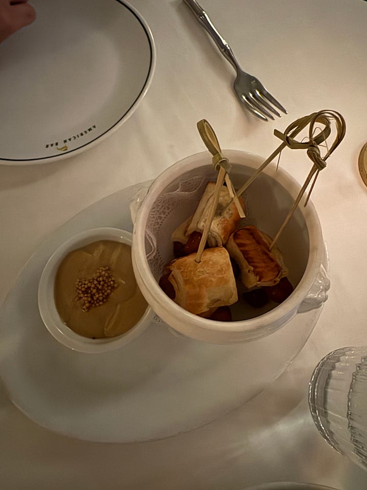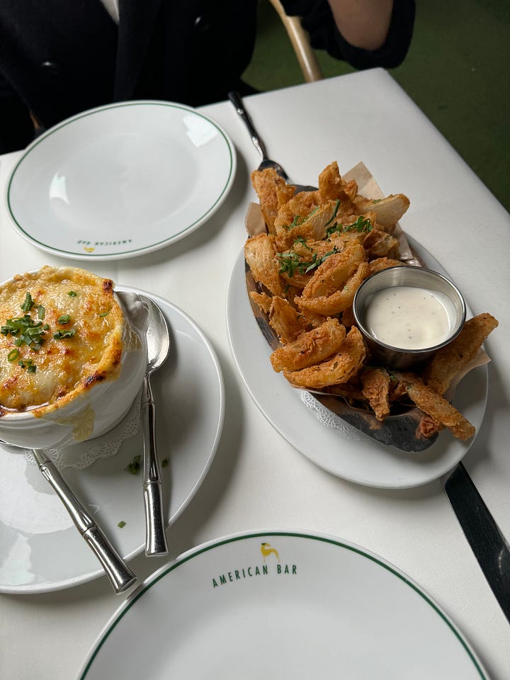 The most fun part of eating at American Bar is the appetizers. I’ve ordered the pigs in a blanket quite a few times, and while they’re most definitely expensive for what they are, like an addict, I can’t stop ordering them. The dijon mustard they serve with it is exceptional, and there’s something so fun about eating little bits of sausage and pastry off of fancy toothpicks. And then there are the fries and onion strings, the most exceptional part of the menu. Shoestring fries are my favorite, and American Bar nails it, with every bite perfectly crisp, and the onion strings have the most wonderfully delicate fry.