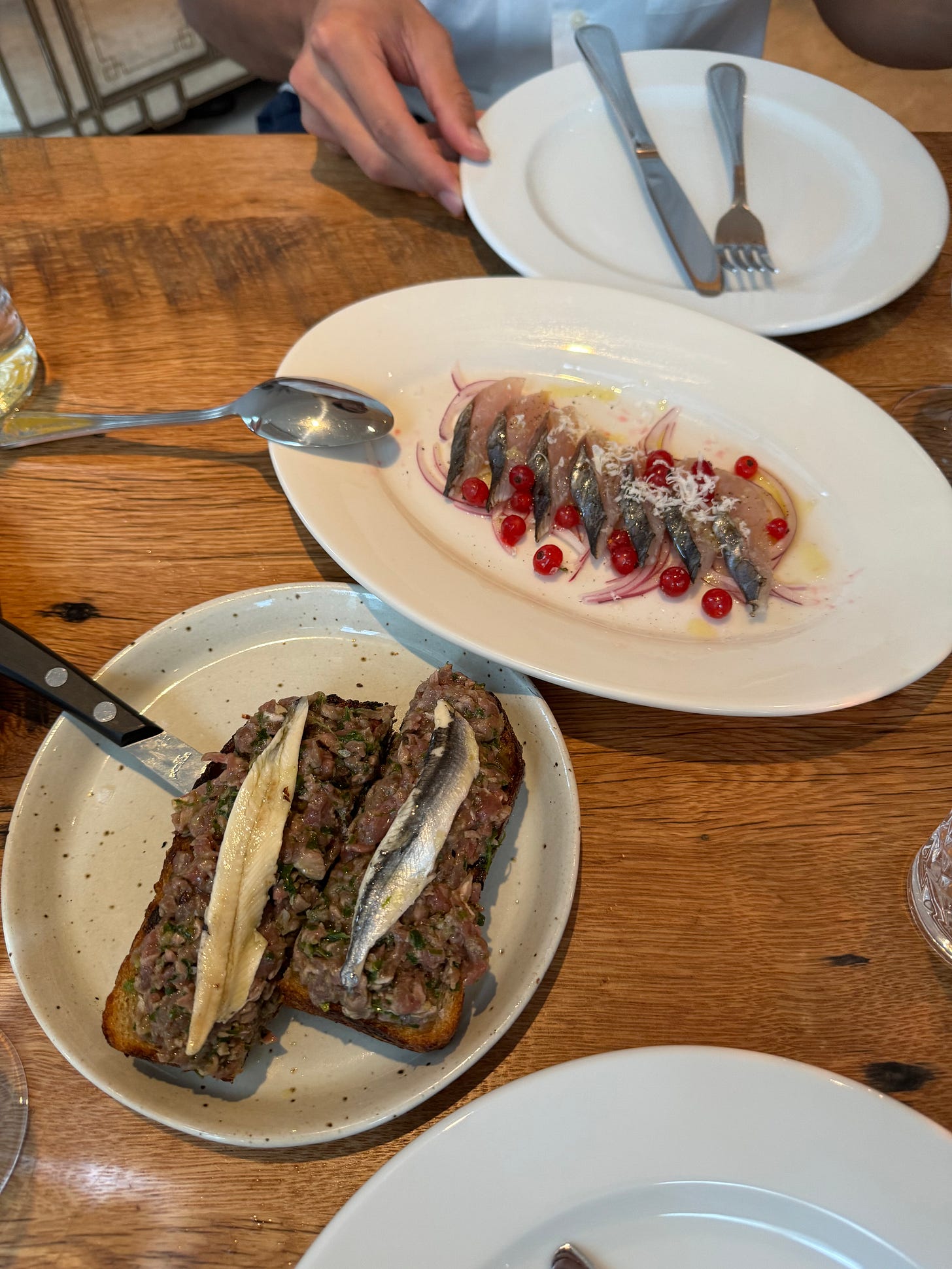 The highlight of the meal was the first two dishes we were served: Atlantic mackerel crudo with red currant, shallot, lemon, black pepper and horseradish and lamb tartare with preserved lemon and shallot served on top of a thick slab of sourdough, topped essentially with a large piece of anchovy. The red currants were sour while the fish was savory and acidic; the lamb and bread taking a back seat to the boquerones, a Spanish preparation of anchovies that includes submerging them in vinegar.