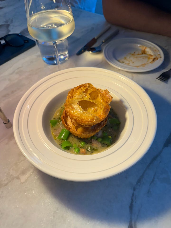 The confit oysters were perhaps one of the most interesting dishes of the night, oysters swimming in lip-coatingly rich chicken fat paired with creme fraiche and spiced Club crackers. I’ll be honest: I didn’t love it, but I do prefer my seafood on the fresher and lighter side, which this was not. But, I can appreciate when a restaurant accomplishes a flavor that’s rich and powerful, and I’m honored to have tasted it. The oyster pan roast, on the other hand, had the balance of fresh and rich that I was looking for. A version of a pot pie, it’s oysters and vegetables topped with an impossibly crisp puff pastry.