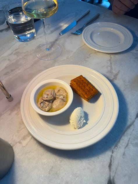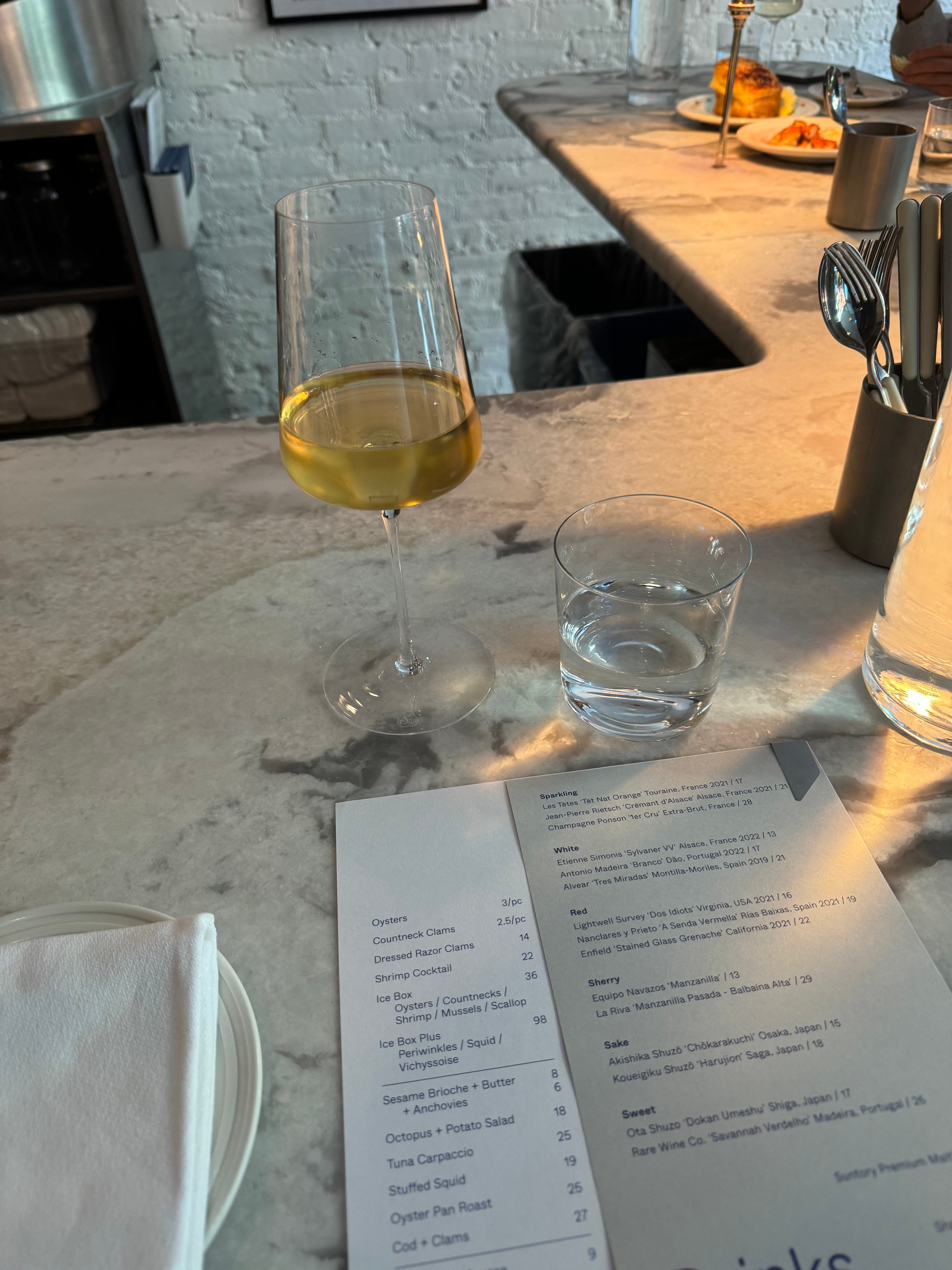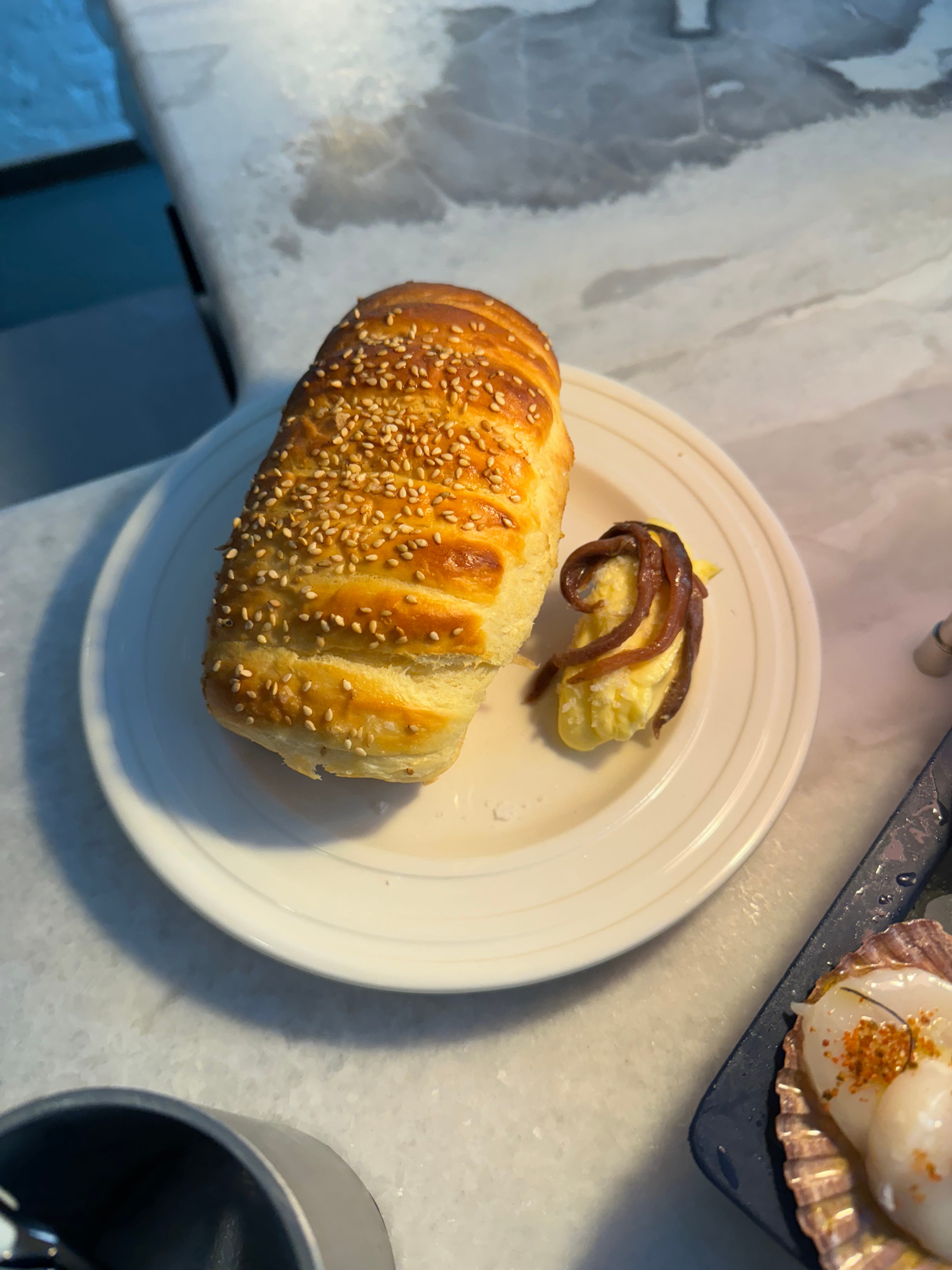 The second item you must order is the sesame brioche paired with butter and anchovies. Yes, without the anchovies it’s one of the only dishes on the menu that doesn’t feature seafood, which makes it a nice way to break up the meal, but it’s also probably the best bread I’ve had at a restaurant in New York. (Bold claim but it’s true!) Its pillowy softness makes it a bit of an unusual choice to be served at a raw bar, but with that perfect bite of brioche and butter and anchovy, all is forgiven. We ordered this twice: once at the beginning and once a few glasses of wine in…