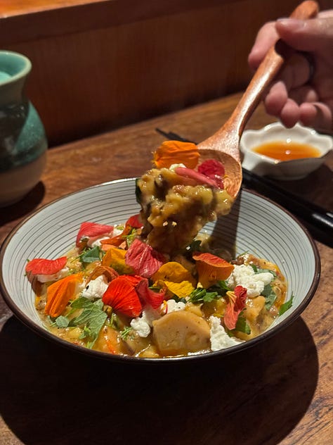 The feeling of eating at a friend’s place extends beyond the general setup of the restaurant: though you can just order off of the menu like normal, during both of our visits, we started a conversation with the chef, which led to an omakase-like experience, us collaborating with the chef to determine our perfect meal. Throughout our meal, the restaurant staff checked in with us like old friends, asking what we thought about certain dishes and if we had room for more in between bits of banter amongst themselves. And to add to the general are we just all hanging out atmosphere, during our more recent visit, Talia and Neeraj popped in after their dinner around the corner to say hi, raising their voices to reach across the entire restaurant to us in the back corner. It was sweet and embarrassing and no one in the restaurant batted an eye…