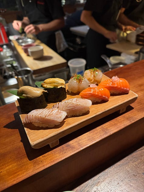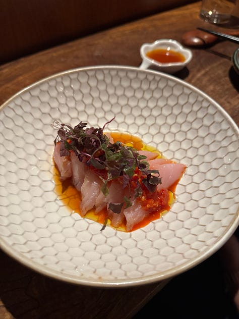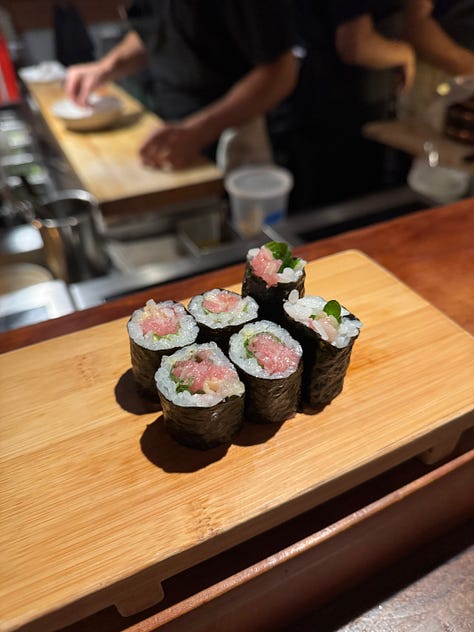 Rosella does a brilliant job of highlighting these less common seafoods through sushi—definitely ask the staff what they’d recommend. I tried pickled mussel sushi for the first time, which I found too acidic for my taste, but it was undoubtedly unlike any sushi I had ever had before. (Viraj loved it.) The shrimp nigiri was also outside of my usual sushi preferences, but an excellent suggestion from the chef. We got two rolls: fatty tuna & white kimchi and spicy tuna. I appreciate that Rosella can take relatively familiar items and put their own spin on it, like using thick cuts of tuna and fresh herbs for the spicy tuna roll.