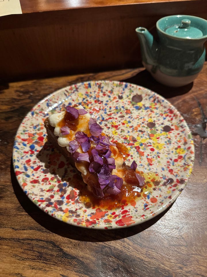 Though we were so unbelievably full at this point in the meal, dessert at Rosella is just as special as everything else. They had a corn nut ice cream the night we were there, which we happily ordered alongside the miso carrot cake. The ice cream reminded me of Milk Bar’s cereal milk flavor, but also tasted exactly like corn nuts… Impressive. I will always order a carrot cake if it’s on the menu (and theirs is good!), but this ice cream was so complex and interesting. And it’s always good to end a meal with a thinker, I think!