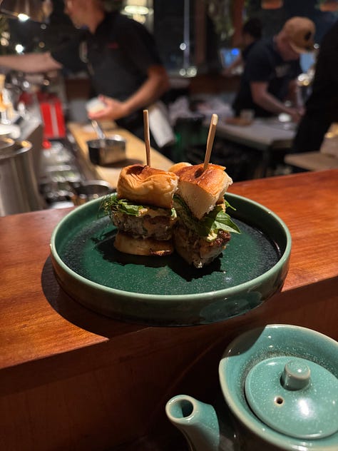 It might be tempting to skip the other dishes, but don’t. My favorite dish of the meal was the summer sashimi: albacore, pickled Nardello salsa and ponzu. It highlights great quality fish with an unexpected twist, combining the sweetness of Nardello peppers with the citrus of ponzu. The fish sausage sliders were also incredible, with a fluffy bun and a patty made of thick cuts of various fish that you can really taste. At this point of the meal we were pretty full. But, Viraj still had his eye on the XO grits, so we ordered a half portion. Like every dish at Rosella, it was much more nuanced than expected, a supremely fishy (complimentary) and savory concoction that tasted like the ocean… if it was cheesy?