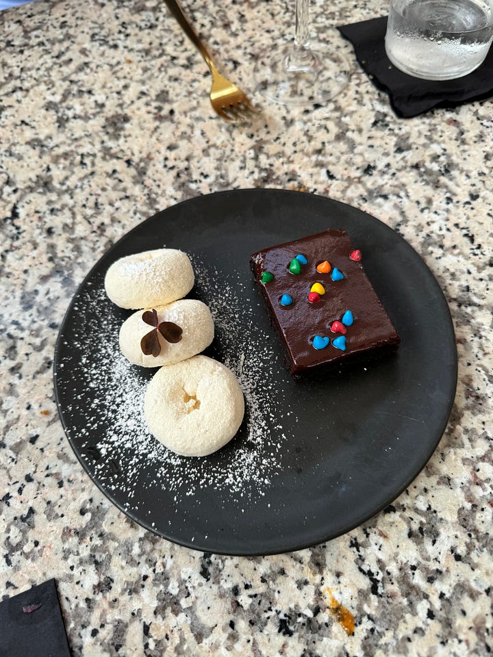 We ended our meal with two desserts, because we couldn’t whittle it down to one, and enjoyed their white chocolate cheesecake and the iconic “bodega special,” a cosmic brownie and powdered sugar donut ice cream. The cheesecake was absolutely heavenly, especially the brown butter crumble that acted as the deconstructed cheesecake crust. I liked it more than the cosmic brownie, mostly because I expected the donut ice cream to be a true ice cream, rather than a semifreddo. I’m being picky here, but I just don’t like the velvety, mousse-like texture of semifreddo, which felt too airy to slather on bites of brownie. But, it did taste exactly like a powdered donut.